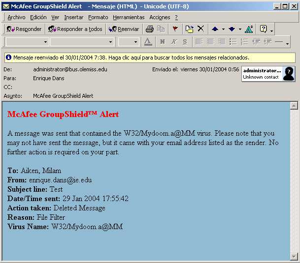 Al hilo del post anterior… acabo de ver un mensaje que me ha entrado de un administrador de red, en el que me notifica que le he enviado un correo infectado con MyDoom… Os pueden llegar mensajes similares, pero tranquilos, no son lo que parecen…
