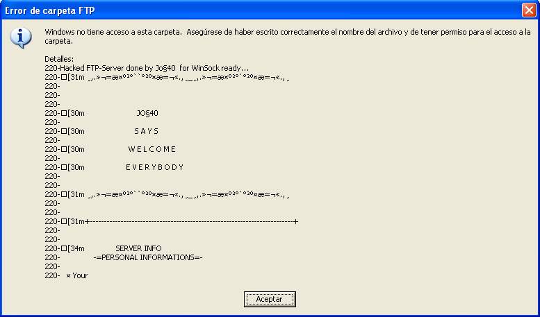 Mirad que «simpático tema» me he encontrado cuando iba a actualizar mi página (no esta, sino la «oficial», la alojada en el Instituto). Resulta que a un «encantador» hacker le ha parecido muy divertido impedir el acceso a mi servidor de FTP, y ha dejado, por supuesto, su firmita de pobre hombre cuya escasa autoestima necesita hacer estas cosas para creerse de algún valor. Por culpa de la «hazaña», ahora no puedo actualizar mi página ni colgar mis nuevos artículos hasta que alguien el lunes arregle la «travesura». El hecho me hace pensar en hasta que punto existen imbéciles en la especie humana capaces de estropear una propuesta de valor tan bonita, tan libre y tan poco regulada como Internet. Por culpa de mamones como éste y otros, Internet acabará siendo un entorno regulado y lleno de rigideces, algo parecido a lo que ya teníamos antes de inventarlo.