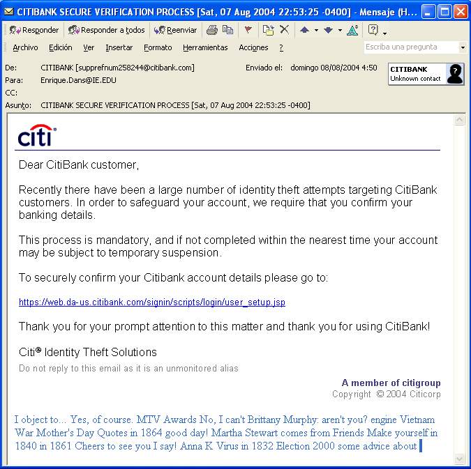 Si ayer hablábamos del último caso de phishing detectado, que afectaba a Citibank, hoy lo podemos comprobar en la práctica: aquí tenéis la imagen del genuino mensaje de phishing que acabo de recibir… Como veis, hace referencia a «los últimos problemas de seguridad», y me pide que confirme mis detalles bancarios en una dirección «sospechosa», que al entrar parece bastante legítima, con sus logotipos, sus menús desplegables, sus pop-ups y todo. Una página con dominio «citi.com», perfectamente «clonada» de la original americana, hasta el punto de que incluye también su versión en español. Yo soy cliente de Citibank a ambos lados del océano, y mis direcciones para acceder a mis cuentas son en ambos casos con dominio «citibank.com», no «citi.com», pero dado que el banco promueve activamente la denominación «citi», ese pequeño detalle se le puede pasar a cualquiera (aparte por supuesto de que se pueda fácilmente falsear la dirección mostrada).