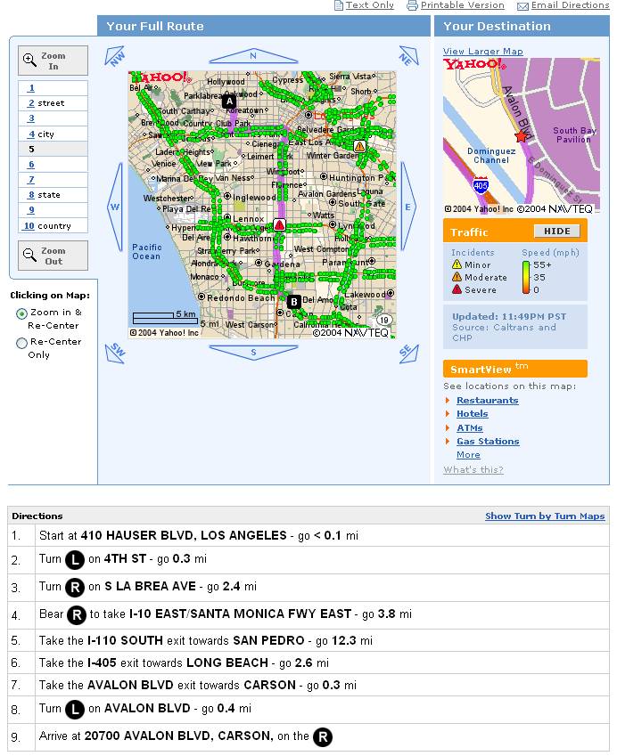 Para probarlo, metí la dirección de mi casa en Los Angeles, y le dije que quería ir al IKEA de Carson. Un desplazamiento que, de hecho, hice en su momento unas cuantas veces ayudándome de Yahoo! Maps. La página generada es prácticamente igual a la de entonces, un mapa con una línea que marca la ruta, y una serie de instrucciones (aquí una captura) muy claritas para ser seguidas en el coche: toma esta calle, anda tantos kilómetros, tuerce en esta otra… Hasta yo podía llegar sin perderme. La novedad estriba, ahora, y me parece galáctico, en que Yahoo! recurre a departamentos de transporte metropolitanos, proveedores de información privados, sensores de tráfico en las calles, cámaras, scanners de la policía y hasta helicópteros para darnos esto: un mapa con las condiciones reales del tráfico, con colores que indican la velocidad media, y una señal de alerta en cada incidente, en la que podemos hacer clic para ver su descripción (aquí tenéis una captura, como eran las doce de la noche en Los Angeles cuando lo probé, todas las calles aparecen en verde, pero pueden verse un par de incidentes).