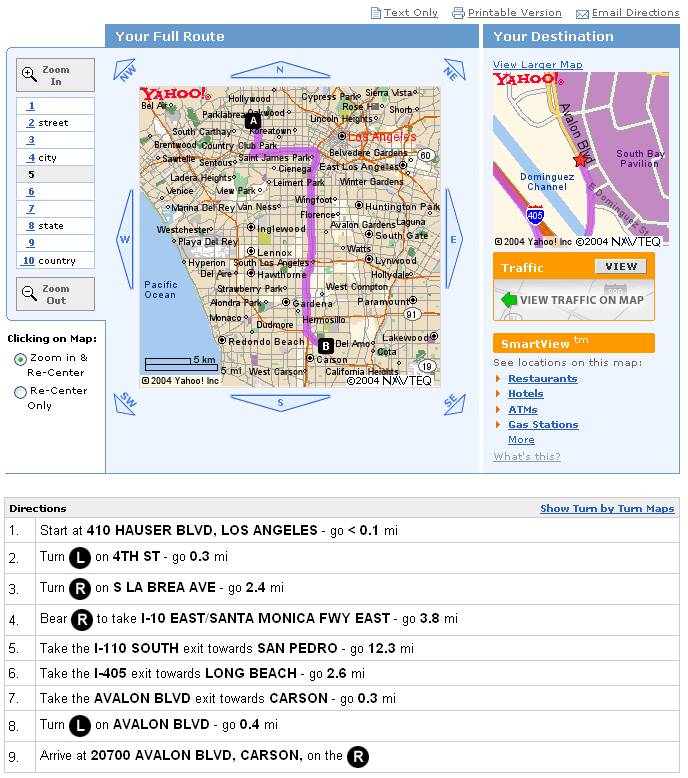 Cualquiera que me conozca, sabe de mi proverbial habilidad para perderme en cualquier sitio. Hay peronas con sentido de la orientación bueno o malo, el mío es simplemente inexistente. Por eso, el servicio de Yahoo! Maps era uno de los que más utilizaba cuando vivía en Los Ángeles, una ciudad enorme, de once millones de habitantes, no especialmente complicada en su configuración, pero como todo, con sus rarezas, peculiaridades y dificultades… completamente imposible para mí sin ayuda. En aquella época, mi «mejor amigo» era, como no, el servicio Yahoo! Maps: imprimía la ruta, y ésta te marcaba cada intersección, cada giro, cada calle, cada maniobra… sin errores, perfecto. Llegué incluso a ir poniendo a cero el cuentakilómetros en cada intersección, para así no tener problemas de indecisión cuando llegase la siguiente (sí, lo mío es patológico… subiros a un coche conmigo y lo entenderéis). No era sólo yo, Yahoo! Maps era uno de esos servicios indispensables entre la comunidad estudiantil de UCLA: siempre que alguien montaba una fiesta, añadía las «driving directions» e incluía el vínculo al correspondiente Yahoo! Map.