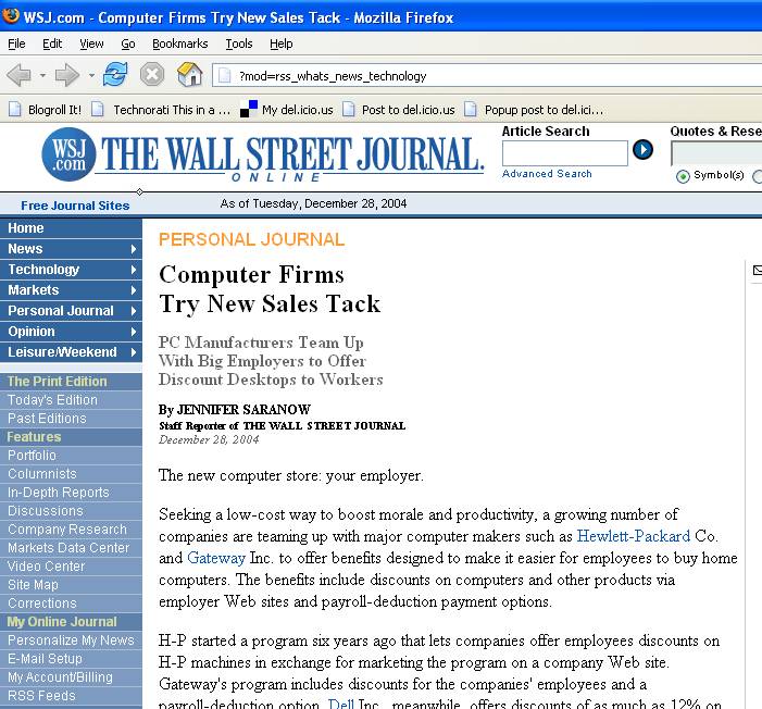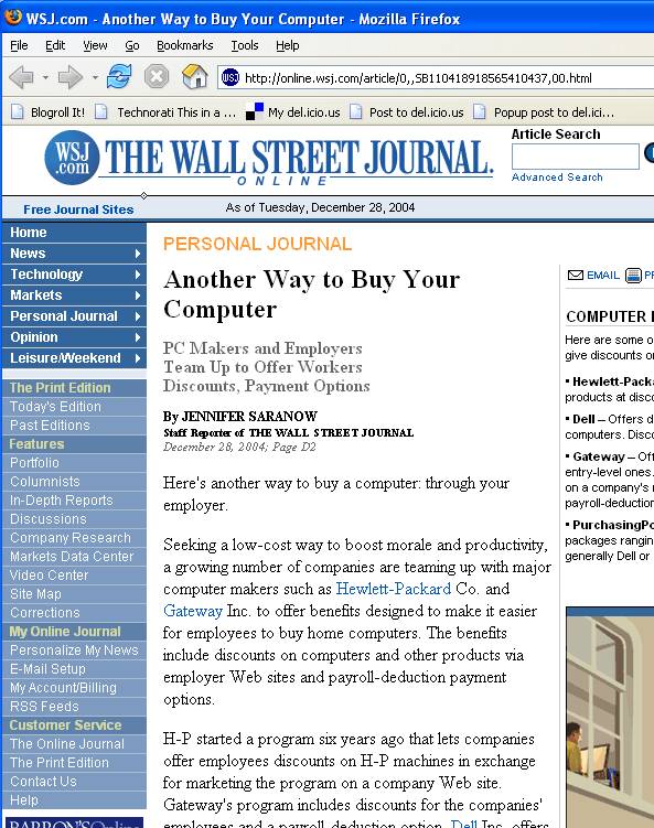 Curiosamente, ese nicho de mercado ha sido detectado por las compañías del sector tecnológico, que por tanto se están acercando a empresas de todo tipo con ofertas para sus empleados. De hecho, resulta interesante que el artículo de Jennifer Saranow haya cambiado de título y enfoque desde que lo leí ayer… Ayer se titulaba, con una clara connotación negativa, «Computer firms try new sales tack«, es decir, algo así como «las empresas de ordenadores intentan nuevos trucos para vender», mientras que hoy hemos pasado al claramente positivo «Otra forma de comprar tu ordenador«… Pena que estos deslices no puedan esconderse en la blogosfera :-)