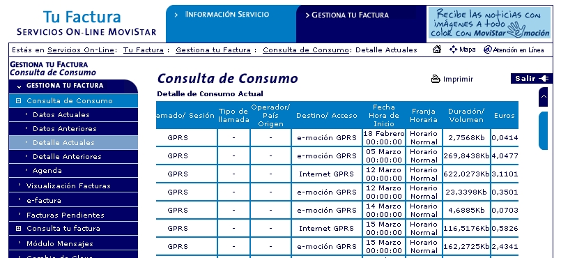 ¿Qué podemos ver en esa factura? En primer lugar, la existencia de dos posibilidades de conexión: una tal «e-moción GPRS», y otra, llamada genéricamente «Internet GPRS». Que no se diga que en Telefónica no saben confundir al cliente. Al analizarlas con más cuidado, y armados de las correspondientes reglas de tres, nos encontramos con los siguientes escalofriantes datos: La transmisión de un mega de datos a través de la tal e-moción GPRS cuesta… adivina, adivina… ¡¡Quince euros!! Pero no queda ahí la cosa… resulta que la transmisión del mismo mega a través de Internet GPRS sale por cinco euros. Efectivamente, adivino el porqué del nombre e-moción: me resulta profundamente e-mocionante saber que por el hecho de navegar desde el móvil con e-moción me estoy gastando ¡¡el triple!!. Vamos, estoy verdaderamente e-mocionado. No hay más que verme.