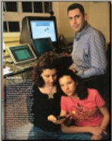 Por último, un poco de cotilleo sobre las fotos: me parecen buenísimas, la de Nacho con su pegatina de filesharing, la de Gemma con «ese punto Matrix total», la de Hernán vestido de mujer, la de Wicho con los buceadores de la Casa de los Peces de fondo y la de Adolfo con cara de «dispara ya que me estoy descarajillando de risa»… Sobre la de mi family, la fotógrafa, que vino equipada con un impresionante pedazo de Hasselblad de las clásicas, nos pidió que posásemos con cuantos más artilugios mejor, pero ese día me faltaban dos portátiles, así que «volví a la vida» ese que se ve en el centro al lado del Tablet, que viene a ser un histórico Pentium 100 MHz. que data de 1996, de cuando llegué a UCLA, y que se apagaba el pobrecito cada dos minutos… lo de que la pantalla se vea oscura no es un efecto de la iluminación, es que es así. Susana y la niña están viendo una página en el BlackBerry, y el Mac, el pobre, se quedó exiliado en el salón por no ponernos a desconectarlo…