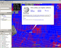 Lo vi ayer en Slashdot, pero como consecuencia de eso mismo, la página estaba slashdotteada y no pude comprobar como funcionaba, así que decidí no escribir sobre ello hasta que lo viese. Hoy lo he vuelto a ver, esta vez en Digg, y aprovechando las tempranas horas, me he metido a echarle un ojo: se trata de GCensus, una aplicación de las denominadas habitualmente mashups o Aplicaciones Web Híbridas, creada por Imran Haque, un estudiante doctoral de Stanford, utilizando los datos públicos del censo norteamericano y la API de Google Earth. Los datos del Censo son algo así como el ser o no ser de la mayoría de los que hemos sido estudiantes doctorales en el área de las Ciencias Sociales en los Estados Unidos: el sitio al que vas para lanzar cualquier hipótesis, para plantear un ejercicio o práctica, para conseguir datos sobre los que trabajar… resulta perfectamente fácil de entender que a Imran le haya dado por trabajar con ellos. Y lo que ha hecho es una aplicación que sin duda hará las delicias de cualquier estudiante doctoral: una aplicación web que permite escoger la categoría de datos a mostrar, y geo-representarla sobre Google Earth para crear mapas visuales con colores superpuestos, de la manera en que antes sólo podía hacerse o bien con mucha paciencia, o con complejos procedimientos sólo al alcance de empresas y agencias gubernamentales. El programa, simplemente un divertimento con pocos datos y aún no terminado, es una delicia: entras, te permite seleccionar el sitio que te interesa, el nivel de granularidad, el tipo de dato que quieres representar, y descargar una capa en formato .kmz que puedes ver directamente sobre Google Earth. En la foto, por ejemplo, está la representación racial en la zona de Los Ángeles en la que vivía yo, combinada con otro mashup, éste realizado con Wikipedia, que permite ubicar lugares en el mapa y obtener al hacer clic sobre ellos su descripción en Wikipedia.