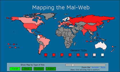 Las conclusiones son bastante impactantes, traduzco unas cuantas (hay más en el informe completo): por ejemplo, el país más peligroso de los medianamente conocidos es Rumanía, con un total de 5.6% de sitios peligrosos, seguido de Rusia con un 4.5%. En dominios «exóticos», como Santo Tomé y Príncipe (.st), el porcentaje de sitios que sería mejor evitar llega nada menos que al 19%. Los sitios más seguros son los escandinavos e Irlanda, y por supuesto el .gov de los sitios gubernamentales norteamericanos. El peor sitio para sitio para apuntarse a cualquier cosa es un dominio .info, así como Rusia o Corea del Sur: en ellos tienes más de un 20% de posibilidades de ser incluido en una lista de spam. Igualmente, descargar cualquier cosa de un sitio búlgaro o samoano te da una probabilidad del 10% de que sea una descarga peligrosa.
