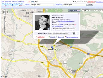 Siguiendo al maestro Orihuela, acabo de apuntarme en MapMyName, un proyecto de investigación de JoÃ?£o Ribeiro y Sérgio Veiga en la Universidade de Aveiro, que pretende averiguar el número de usuarios de Internet mediante un método piramidal que usa la dinámica de redes sociales. Cada usuario se da de alta en un proceso simple y rápido en el que se geolocaliza, aporta nombre, apellido, fecha de nacimiento, profesión, URL y dirección de e-mail (utilizada para comprobación), e invita a tres amigos a apuntarse. El proyecto empezó el 22 de Abril, Día de La Tierra, se pretende que se complete en un mes, utiliza un mashup de aplicaciones entre las que se encuentra Google Maps, y aún no facilita estadísticas, aunque empezará a hacerlo en breve. Puede ser interesante al intentar llevar a la práctica las tesis del Small World de Milgram y generar una visión geolocalizada de los usuarios de la red.