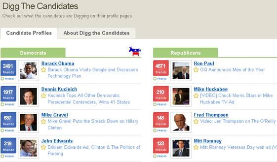 Una iniciativa de Digg de cara a las próximas elecciones presidenciales norteamericanas demuestra de nuevo la gran distancia entre los Estados Unidos y España en cuanto al uso de herramientas en Internet: en Digg the Candidates aparecen todos los candidatos a las elecciones y los usuarios pueden hacerse amigos de aquellos políticos que les interesen, lo que ya de por sí genera un ranking de popularidad. Pero además, la página permite seguir el perfil de actividad de los candidatos como usuarios de Digg: las noticias que han enviado, las que han votado, los comentarios que han hecho, el contenido que han señalado como favorito…