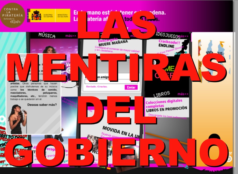La web refleja una falsedad conceptual detrás de otra, confundiendo intencionadamente todos los conceptos, mezclando descargas con «piratería» y haciéndolas absurdamente responsables hasta de la caída del imperio romano. Como muestra, recorto un texto (negritas en el original) que surge cuando pasas el ratón sobre la imagen de una cantante con cara de desesperada, que arroja su micrófono malhumorada por la terrible incidencia de «la piratería», y que no deja lugar a dudas acerca de la simpleza y ligereza de los argumentos con los que pretenden que comulguemos, casualmente los mismos que los de la SGAE y todo el culturetariado, y que el gobierno, ese gobierno elegido por los españoles, hace suyas de la primera a la última letra, pagándolo además con el dinero de nuestros impuestos: