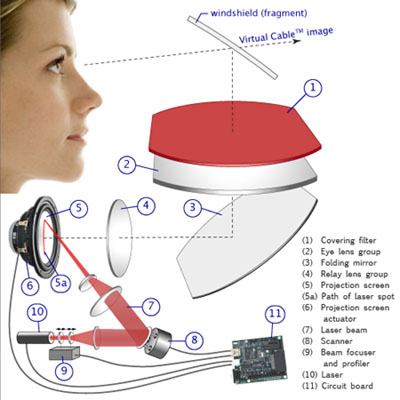 En la página de la empresa aparecen tres pequeños vídeos cortos en los que se recrea el concepto, aunque por el momento están desarrollados artificialmente con imagen pintada sobre el vídeo. La empresa ha patentado el concepto consistente en proyectar, mediante un sistema de espejos y láser, la imagen tridimensional del cable sobre el parabrisas, de manera que no hay que dotar a éste de ningún tipo de pantalla especial, es simplemente una imagen proyectada desde detrás del cuadro de mandos del vehículo. Este ingenioso sistema hace que el precio esperado para la unidad, unos $200, resulte perfectamente razonable en comparación con los sistemas de GPS tradicionales.