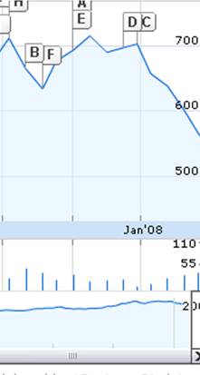 Interesante artículo en Wired, «As Downturn Looms, Google Looks Recession-Proof«, acerca de las perspectivas de Google de cara a la actual perspectiva de crisis económica. El valor ha perdido un 18% en los últimos tres meses debido al análisis de los históricos que muestran que el negocio publicitario siempre ha sido uno de los más afectados por las recesiones: tradicionalmente, la publicidad se retrae de manera casi simultánea a como lo hacen los niveles de consumo, y Google es una empresa cuyos ingresos dependen en un 99% de la publicidad. Aparentemente, no es el mejor sitio para estar en caso de entorno recesivo, y así vemos que el comportamiento de la acción ha pasado de superar la astronómica barrera de los $700, a cotizar actualmente en torno a los 550, una caída más que apreciable.