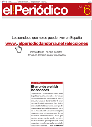 La enésima prueba de que en la era Internet, las leyes que restringen la circulación de la información tienen un valor nulo nos llega gracias a El Periódico de Catalunya, que ha decidido saltarse a la torera la Ley Electoral y la prohibición de difundir encuestas de intención de voto durante la semana previa a las elecciones mediante un subterfugio sencillísimo: publicarlas en su edición de Andorra. La ley en cuestión, como El Periódico dice en su editorial, es sencillamente absurda, y supone una clara violación de la libertad de expresión: si bien pudo ser adecuada en los inicios de nuestra naciente democracia, cuando los ciudadanos podían ser «demasiado influenciables» por las evoluciones de las encuestas, hoy en día no tiene sentido adoptar una actitud paternalista de sobreprotección contra lo que, además, no puede ser protegido: esa información sigue siendo elaborada regularmente por las empresas de sondeos para el uso interno de los partidos y las élites, y resulta imposible constreñirla en un entorno en el que un simple SMS, mensaje de correo electrónico o envío a una publicación fuera de nuestras fronteras puede hacerla circular con completa libertad.