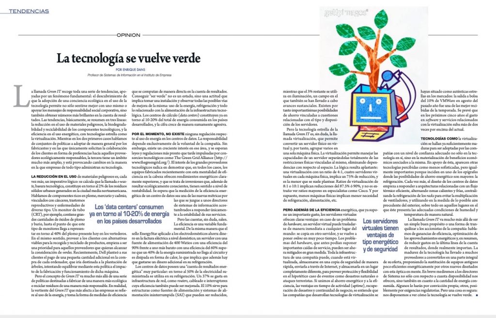 Me publican en Capital este artículo, «La tecnología se vuelve verde«, de tipo muy introductorio acerca de los temas de Green IT en los que empecé a trabajar hace cierto tiempo. Una visión general incluyendo fabricación eco-responsable de componentes electrónicos, reciclaje y recogida de artículos usados, y un énfasis algo mayor en los temas relacionados con uso eficiente de la energía en data centers, refrigeración, virtualización, etc. sobre los que he escrito ya algunas veces por aquí bajo la etiqueta Green IT.