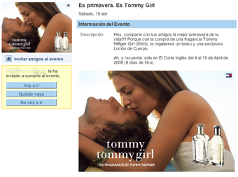 La campaña con la que Tuenti ha iniciado sus ensayos es la que veis en la ilustración: una promoción de Tommy Girl, con llamada directa a la acción, y con unos criterios de segmentación muy específicos y definidos por la marca. Los resultados tras una semana son claros: alrededor de un 22% de las personas invitadas a participar en la acción han visitado la página del evento patrocinado, y algo más de un 10% se han mostrado interesados en la oferta. La campaña ha obtenido tres millones de impresiones del evento patrocinado, y más de 1.700 comentarios de usuarias de Tuenti en el tablón de la acción.