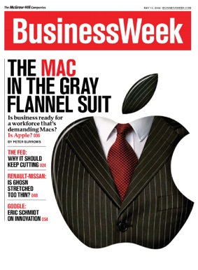 Business Week revisita como tema de portada y con extensa cobertura el asunto del uso de máquinas Apple en las redes corporativas, «The Mac in the gray flannel suit«, precisamente cuando al ordenador de mi despacho se le acaba el renting y estoy comentando ese mismo tema en el Instituto de Empresa. La cosa no es en absoluto novedosa, hablamos de ello ya hace más de un año al hilo de un artículo similar en ComputerWorld, pero curiosamente, las circunstancias que se apuntaban en aquel no han hecho más que cumplirse y aumentar con creces: las ventas de Apple han crecido más de un 51% de año a año, un 87% de compañías tienen alguna máquina Apple en su red (frente a un 48% de hace dos años) y ya sólo los más viejos y nostálgicos del lugar mantienen aquel tópico de que «los Mac son sólo para diseñadores y creativos». Los Mac han revelado ser además fantásticas máquinas para correr Windows, lo que ha hecho que haya hasta quien sostiene que el mismísimo Ballmer usa uno. El durísimo fiasco de Windows Vista a nivel corporativo sigue alentando opciones alternativas y, como el propio artículo de BW comenta, si la penetración de Apple en el mercado doméstico crece agresivamente, la de personas que no quieren ser «Windows de día, Apple de noche» también lo hace.