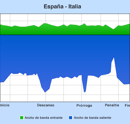 A la izquierda, la gráfica de ancho de banda entrante y saliente en Tuenti durante el partido España-Italia, el evento de mayor audiencia de la historia de la televisión en España, con casi dieciséis millones de espectadores. En un subsegmento como el del público de Tuenti, definido como el de los llamados «nativos digitales», ¿qué demuestra este gráfico? Simplemente, que nadie se queda a ver los anuncios de televisión.