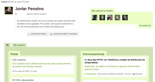 Me gustan mucho las las llamadas «páginas de usuarios», el desarrollo que hemos sacado hoy en Xataka (disclaimer: tengo una pequeña participación accionarial en Weblogs, S.L. y una labor habitual como asesor de la misma) sobre el que hay más información en el blog corporativo o en entradas en la propia Xataka, en Merodeando y en Error500. Y me gusta por dos razones: primero, porque explora el interesantísimo camino entre los blogs y las redes sociales, que llevo tiempo intentando explorar yo con éxito escaso, pero que me sigue pareciendo fascinante. Bajo mi óptica, la comunidad de lectores de un blog forma una suerte de red social con sus comentaristas habituales, sus esporádicos, sus lurkers, sus seudónimos, etc. y lograr materializarla, «solidificarla» o reforzarla en sus funciones y posibilidades es algo que tiene para mí un gran interés.