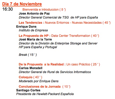 A estas horas, yo tenía que estar dando una charla y moderando posteriormente una mesa redonda en un evento de HP sobre tendencias en datacenters, una jornada de alto nivel en Oporto para directivos sobre todo del sector público y financiero, con presencia del Presidente de la compañía, Santiago Cortés, y para el que había sido requerido en mi calidad de analista independiente. La agenda del día la podéis ver en este vinculo. Para mí, es algo habitual: una empresa quiere reunir a sus clientes o prospects en un evento, solicita mi participación como experto independiente que hable de tendencias, y después habla de sus propuestas comerciales, tema en el que yo lógicamente no participo, y que únicamente exige comprobar que lo que yo libremente comento como tendencia no este desalineado con lo que la compañía lleva en su cartera. En el caso de HP y de las tendencias en datacenters, además, no era así. Mis tendencias y sus productos resultaban agradablemente compatibles.