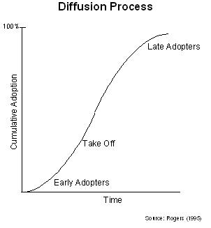 Es una buena manera de medir la difusión, pero sigo preferiendo el Hype de Gartner (http://en.wikipedia.org/wiki/Hype_cycle) para mostrar el estado en el que se encuentra una tecnología en su ciclo de «espectativas».