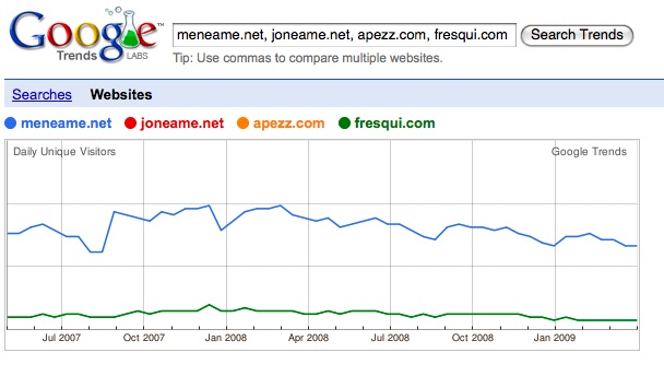 Será interesante poner el gráfico de google trends dentro de unos días, de hecho, si lo miras hoy… sopresa! Ya aparece Apezz.com, uno de los servicios que comentabas que en la gráfica ni aparecían al lado de meneame (lógico, solo lleva unos días online).