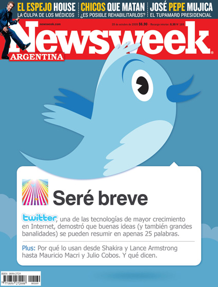 twitternewsweekargentinaSebastián Catalano, Editor de la edición argentina de Newsweek, me contactó por correo electrónico para hacerme algunas preguntas sobre Twitter, tema al que dedican su artículo de portada. El artículo de Sebastián se titula «Twitter, o la vida en ciento cuarenta caracteres» (pdf, 1.6 MB)