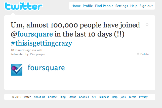 Buen artículo en Mashable sobre los usos que algunas empresas están haciendo del último caso de crecimiento exponencial en el terreno de los medios sociales, Foursquare: en «How 5 brands are mastering the game of Foursquare» podemos ver los usos que dan a la aplicación un hotel de lujo, la oficina de turismo de una ciudad, una revista, una cadena de heladerías o una de cafeterías.