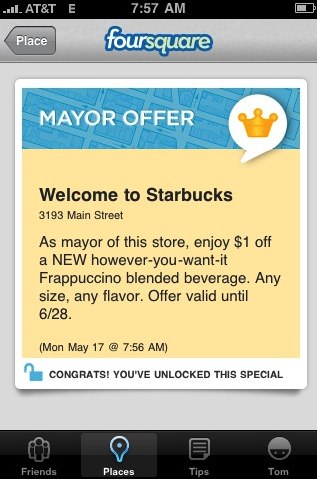 Veo en Mashable, «Mayors of Starbucks now get discounts nationwide with Foursquare« cómo Foursquare empieza a explorar su modelo de negocio con acciones específicas y cuantificables: los que obtengan la categoría de Mayor en un Starbucks podrán obtener, mostrando su terminal en la tienda, un descuento de un dólar en un producto concreto, un Frapuccino, que viene a significar en torno a un 25% en función de tipo y tamaño solicitado.