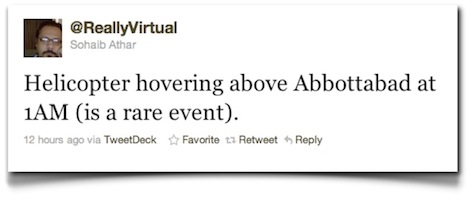 Osama bin Laden fue abatido a la una de la madrugada del día dos de mayo en Abbottabad (Pakistán), las diez de la noche del día uno de mayo en Madrid. El momento exacto de la operación, cuando los helicópteros sobrevuelan el escenario y cuando se produce la primera explosión están recogidos en Twitter por Sohaib Athar, un consultor de software pakistaní, aunque ni él mismo supo realmente lo que había reportado hasta unas seis horas después.