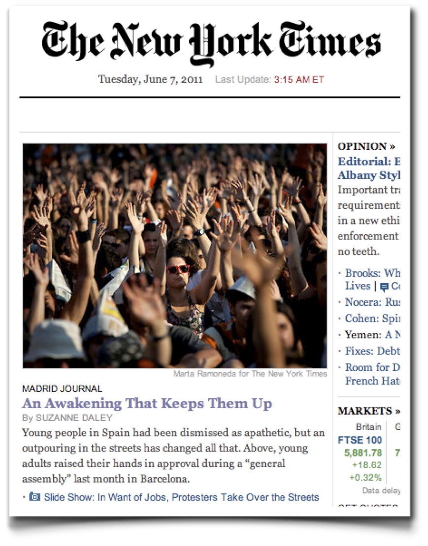 Artículo de portada en The New York Times acerca del movimiento 15M y el despertar de los españoles ante un sistema que no les representa y que exigen cambiar. El artículo, «An awakening that keeps them up all night« está escrito por Suzanne Daley y acompañado por una galería de fotos de Marta Ramoneda, con quienes tuve oportunidad de mantener una larga conversación en mi despacho el pasado día 31 de mayo, y que se documentaron además extensamente mediante múltiples entrevistas sobre el terreno tanto en Madrid como en Barcelona.