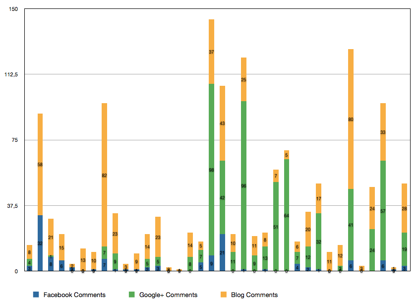 En la segunda gráfica, el panorama es completamente diferente. Como primera conclusión, cabe destacar cómo Google+ ha logrado hacerse en muy poco tiempo con un porcentaje muy significativo de la conversación, con un comportamiento enormemente activo de los usuarios a la hora de comentar las entradas. Obviamente, Google+ ha sabido desarrollar un sistema que favorece la conversación de una manera notablemente más activa que otras redes sociales. Facebook, en cambio, aporta comparativamente muy pocos, lo que refuerza su papel de red que aporta viralidad, pero poca conversación sobre los contenidos (mantengamos las precauciones de que hablamos de un contenido relativamente específico, y que la afinidad con el target inicial de Google+ puede resultar notablemente más elevada). La segunda conclusión nos lleva a la preocupación: no parece demasiado tranquilizador para un generador de contenido que una parte tan significativa de la conversación se vaya a redes sociales fuera de su control. Si esa conversación está resultando efectivamente interesante, lo normal sería que Google ofreciese herramientas para que el que ha generado esa conversación pueda reflejarla allá donde se originó el contenido, permitiéndole consolidarla si lo desea. Veremos si ese tipo de herramientas aparecen: la política habitual de Google ha sido tradicionalmente abierta en este sentido. En algunos casos, los comentarios en Google+ superan claramente a los originados en la propia página, lo que lleva a una atomización de la conversación que puede llegar a ser preocupante.