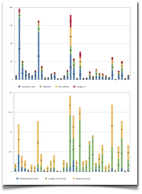 Desde la llegada de Google+, tenía bastante interés por ver la evolución sobre mi página de los dos factores fundamentales para alguien que genera contenidos: la viralidad (número de veces que una entrada es recomendada mediante mecanismos como los Likes de Facebook, los Retweets de Twitter, los Shares de Google Buzz o los +1 de Google) y la conversación (número de comentarios en la propia página frente a comentarios en Facebook y en Google+).