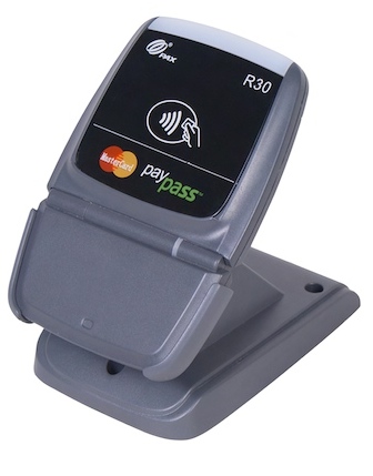 Al lado de estas líneas, un terminal NFC (Near Field Communication) de MasterCard PayPass, uno de los múltiples modelos que podemos ver en cualquier establecimiento que acepte pagos mediante una tecnología en la que se puede pagar mediante objetos tan variados como un terminal móvil, un llavero, una tarjeta, un reloj o cualquier otra cosa en la que se inserte el chip en cuestión (el chip es pequeño porque recibe la alimentación eléctrica por inducción electromagnética desde un campo generado por el propio lector). Recientemente hablamos del tema al hilo de la presentación de Google Wallet, una iniciativa restringida por el momento a un tipo de tarjeta, un terminal, una operadora y un país determinado.