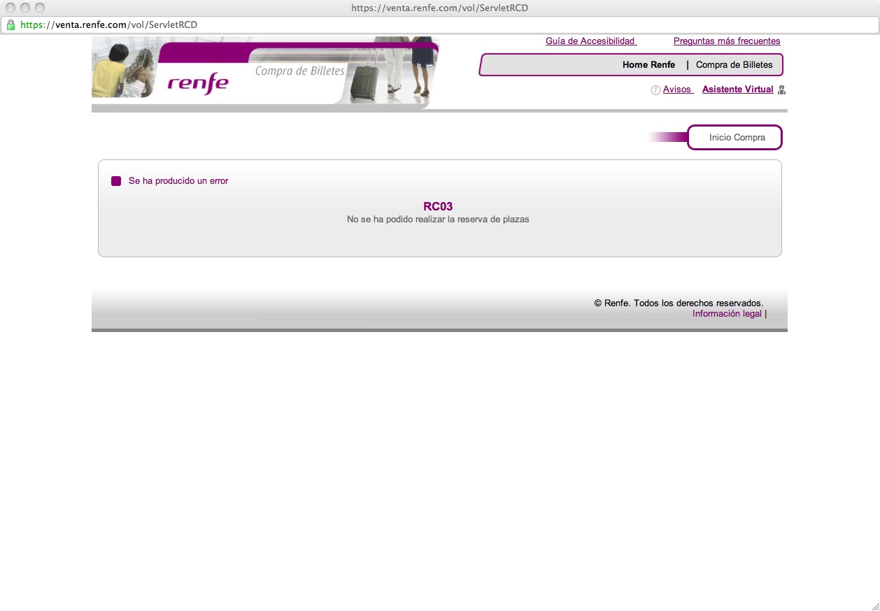 Tras intentar completar el proceso de compra y elegir asiento, recibí un «error RC03: no se ha podido realizar la reserva de plazas» que no me daba pista alguna que me permitiese averiguar si la transacción se había completado o no. Ante el problema, decido llamar al teléfono que se indica en la web como «Información venta internet», el 902 109 420, donde un caballero muy amable me indica que «el error proviene de la aplicación de elegir asientos, que está dando problemas», y me pide que repita la operación sin elegir asiento y aceptando la elección del sistema. Le comento que no, que prefiero elegir asiento, así que le pido que me pase con el servicio de venta telefónica para realizar mi operación a través de ese canal. Tras pasarme con el servicio correspondiente, una señorita me indica que no puede proceder a la reserva, «porque el sistema cierra a las 23:45». A la pregunta de si puedo hacerlo yo a través de internet, la respuesta es que no, que «el sistema está cerrado tanto para ellos como para mí». Ante mi incredulidad de que un servicio web no esté disponible las 24 horas, no obtengo respuesta ni solución alguna, así que me resigno y pienso en repetir la operación a la mañana siguiente, cosa que he hecho sin ningún problema.