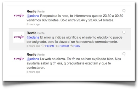 Eso sí: ante lo insólito y anacrónico de la respuesta «la web cierra a las 23:45» y ante la apariencia de que, además, no solo cerraba, sino que echaba a patadas a quien estuviese en medio de una transacción, comenté el tema en Twitter, en Facebook y en Google+. En el primer caso, únicamente un mensaje de texto, «A-LU-CI-NA: la web de RENFE cierra a las 23:45. Y las transacciones que están a medias, las corta. Impresionante documento…». En los otros dos casos, una explicación algo más completa, y un pantallazo del error.