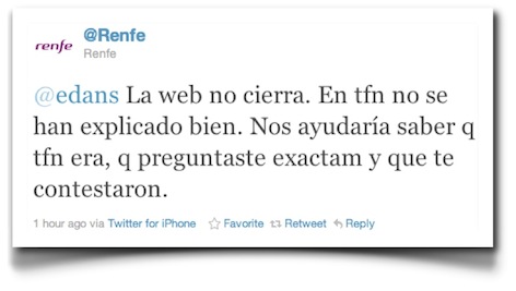 Si el problema, como el sentido común indicaría, no es «que la web se cierra a las 23:45» sino que alguien, absurdamente, lo indica así a los usuarios, deberían tomarse las medidas oportunas y atajarse esos comportamientos poco adecuados. Y dado que existe un evidente problema de comunicación con los usuarios, debería plantearse algún tipo de acción que mejore dicha comunicación: Twitter es interesante, permite reaccionar rápido y dialogar con quienes sufrimos algún contratiempo o problema, pero me temo que no es suficiente. RENFE deberá plantearse de qué manera transmitir lo que desea transmitir, y cómo sacudirse de encima una imagen con la que lógicamente nadie puede sentirse demasiado a gusto.