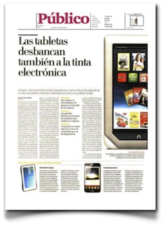 Blanca Salvatierra, de Público, me envió un par de preguntas por correo electrónico acerca de la evolución del mercado de las tablets en relación con los lectores de tinta electrónica, y hoy lo publica en un artículo a doble página bajo el título «Las tabletas desbancan también a la tinta electrónica» (ver en pdf).