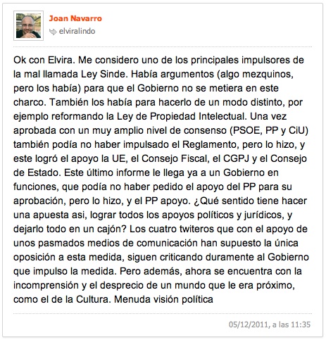 Unas absurdas declaraciones de Joan Navarro, Vicepresidente y Director Senior de Asuntos Públicos de Llorente y Cuenca hechas en El País, en las que se reconoce como «uno de los principales impulsores de la ley Sinde», y califica a los que nos oponemos a dicha ley de «cuatro twiteros con el apoyo de unos pasmados medios de comunicación», desencadenan una tormenta en Twitter que lleva a que la etiqueta #cuatrotuiteros se convierta, en un tiempo récord, en trending topic a nivel mundial. La cuestión, la verdad, no tenía desperdicio: en un solo y desafortunado texto, Navarro conseguía el récord de insultar a los que se oponen a la ley Sinde, a los medios y a los políticos; y de mentir con respecto al apoyo de la UE, el Consejo Fiscal, el CGPJ y el Consejo de Estado.