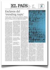 Carmen Mañana, de El País, me llamó por teléfono hace un par de semanas para hablar del impacto de Twitter en las decisiones políticas, al hilo de aquellas declaraciones del ex-presidente de gobierno en las que achacaba al ruído desencadenado en la red la alteración de los planes de aprobación del reglamento de la llamada «ley Sinde» en el consejo de ministros del pasado día 2 de diciembre. Hoy lo ha publicado bajo el título «Esclavos del trending topic» (ver en pdf).
