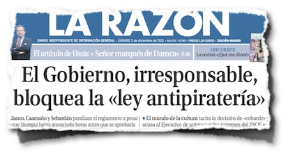 Tras el episodio del fallido intento de aprobación in extremis de la ley Sinde, el gremio de estranguladores de la cultura incrementa su presión, recurriendo con incansable reiteración a los mismos argumentos falsos de siempre. La demencial portada de La Razón, el medio propiedad de un editor que ha pedido abiertamente que se persiga a sus clientes, no es más que una evidencia más de hasta qué punto se pueden perder los papeles.