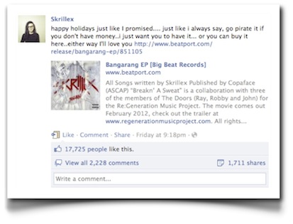 Skrillex (Sonny John Moore), un productor de música electrónica de los géneros electro-house y dubstep nominado ahora mismo a seis Grammys, sacó nuevo disco el pasado 23 de diciembre, y felicitó las fiestas a sus más de dos millones y medio de fans en su página de Facebook con esa frase que tenéis ahí. Toda una muestra de respeto y de actitud adecuada: aunque obviamente prefiero que la compres, obtén como quieras mi música, lo que quiero es que la tengas. ¿Alguna duda sobre cómo le va a ir con su nuevo disco en términos de ventas?