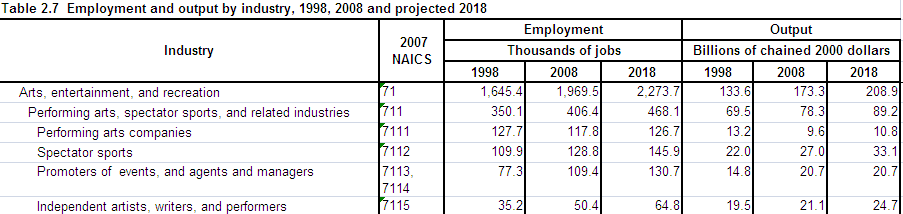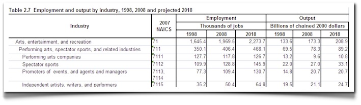 Segun el cuadro que presenta este artículo, la facturacion de las compañias de performing arts pasan de 13.2 billones en 1998, a 9.6 billones en el 2008, y proyectan 10.8 billones en el 2018, es decir en 20 años cae, no crece. Los promotores de eventos, agentes y managers se mantienen en 20.7 billones del 2008 al 2018. Artistas independientes, escritores e interpertes pasan en 20 años (1998-2018) de 19.5 billones a 24.7.