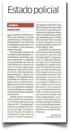 Jesús Miguel Marcos, de Público, me pidió ayer una columna sobre el cierre de Megaupload por parte del FBI norteamericano, columna que titulé «Estado policial» (ver en pdf). Está escrita en aproximadamente media hora según llegaba a casa después de clase y teniendo en cuenta las limitaciones de espacio del papel, así que lo que hice fue elaborar los argumentos después ya con algo más calma en la entrada que publiqué anoche, titulada «Los caminos del download son inescrutables«.