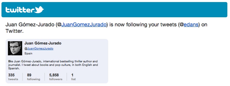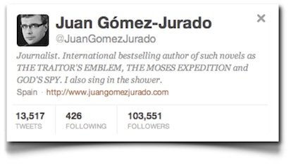 Leyendo el artículo, no pude evitar pensar en un autor español, Juan Gómez-Jurado: escritor y periodista, no he tenido el gusto de conocerle personalmente, pero tengo la sensación de hablar con él casi todos los días a través de su constante participación y diálogo en Twitter con sus más de cien mil seguidores. En abril de 2009, el propio Juan me envió por correo electrónico un artículo suyo en La Voz de Galicia titulado «Sinde, el fallo descomunal de ZP«, que me gustó mucho, pero al que no pude en aquel momento responder. Tiempo después, en enero de 2011, me volvió a escribir para enviarme su fantástico artículo «La piratería no existe«, que me llevó a empezar a seguirle.