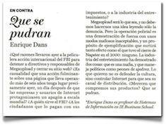 Pilar López, de La Gaceta, me pidió ayer que le escribiese un artículo breve acerca de la operación de cierre de Megaupload. Llevaba varios artículos sobre el tema y quería hacer algo original, así que me dio por jugar poniendo el título del revés. Lo han publicado hoy, se titula «Que se pudran» (pdf). En la web no parece estar disponible, así que copio a continuación el texto del artículo: