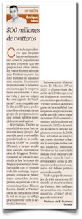 Mi columna de esta semana en Expansión se titula «500 millones de twitteros» (pdf), en un intento de dar cuenta de la dimensión de Twitter para un público, el del diario económico, que en muchos casos sigue considerando ese tipo de noticias como propias de algún tipo de universo paralelo.