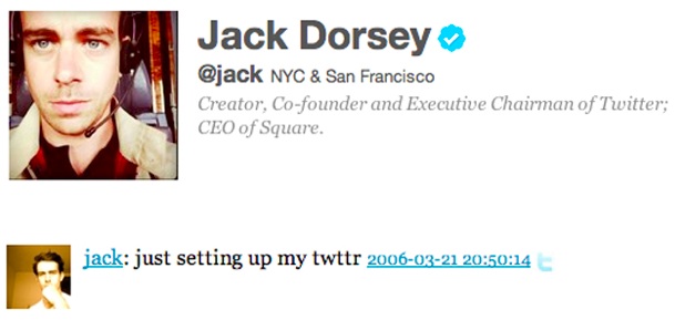 - 21 de marzo de 2006: primer tweet de Jack Dorsey, en un servicio creado casi «por accidente» (solo querían hacer un sistema para saber por dónde andaba cada uno de los miembros de Odeo, su empresa entonces), en un servicio que en aquel momento se llamaba Twttr, sin vocales.