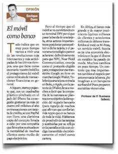 Mi columna de hoy en Expansión se titula «El móvil como banco» (pdf), y hace referencia a los movimientos que estamos viendo en torno al desarrollo del móvil como herramienta para transacciones financieras. Es un tema sobre el que se podría escribir muchísimo, tardé mucho más en recortar la columna a la extensión que condiciona el papel que en escribirla como tal.