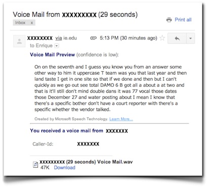 A través del recién instalado sistema de telefonía integrada con el correo electrónico que han adoptado en mi empresa, recibo un mensaje hace un rato con la transcripción de lo que alguien ha dejado en mi buzón de voz. Lo tenéis a la izquierda.