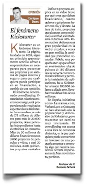 Mi columna de esta semana en Expansión está dedicada a la popularización de los modelos de crowdfunding, financiación colectiva o micromecenazgo, y se titula «El fenómeno Kickstarter» (pdf).