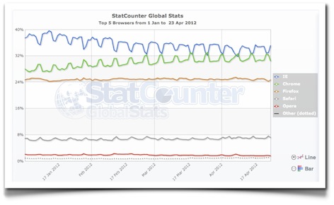 Me ha llamado muchísimo la atención esta gráfica sobre uso de navegadores que pillé al vuelo en un tweet de Matt Cutts, y que refleja, de arriba a abajo, la evolución de la cuota de Explorer, Chrome, Firefox, Safari y Opera estimada por StatCounter, una de las fuentes más fiables para ver estadísticas de uso.